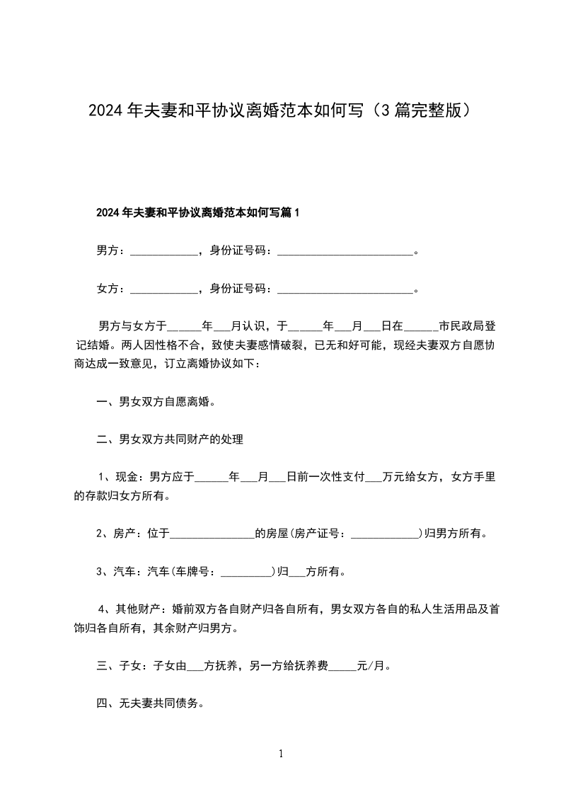 2024年夫妻和平协议离婚范本如何写篇1