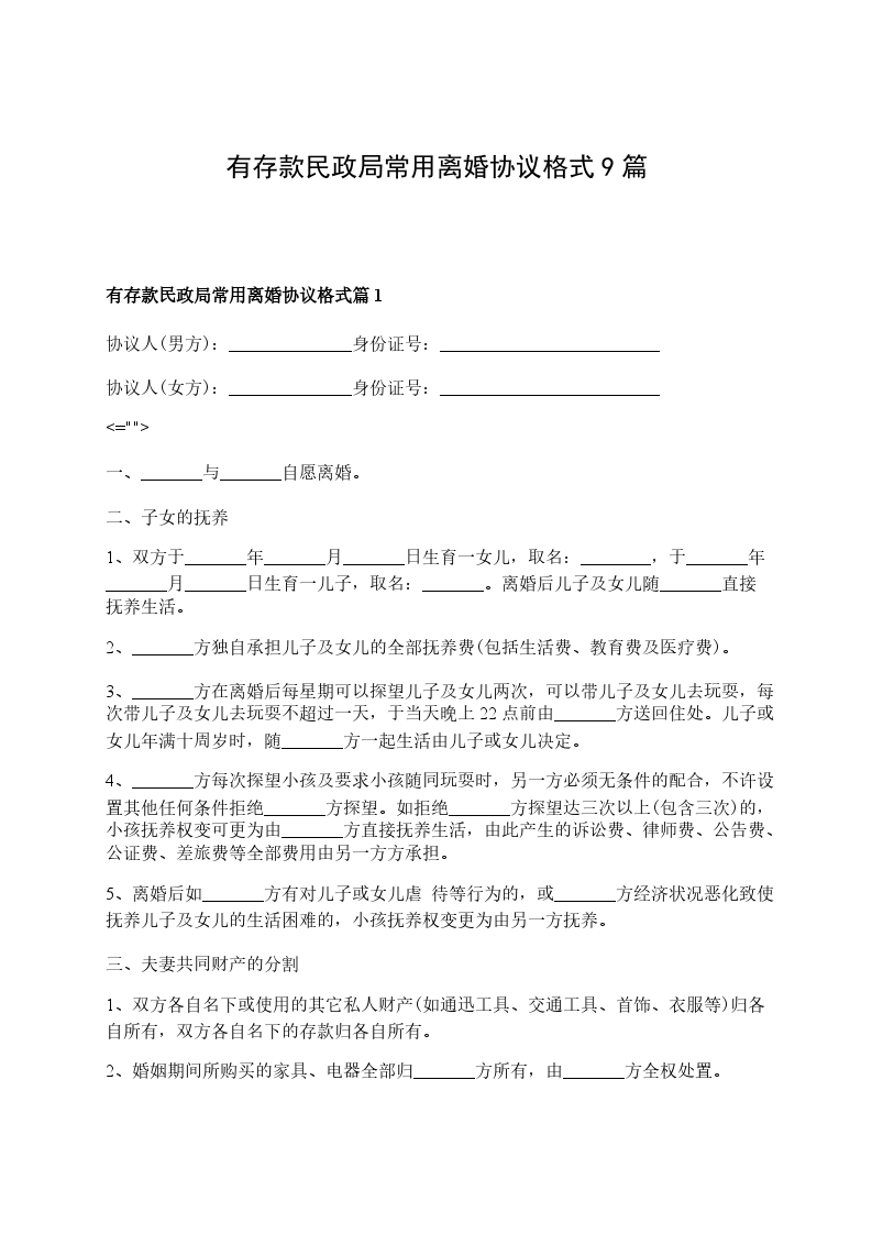1、【存款】双方婚姻关系存续期间,目前共有存款____元,其中男方账户____元,女方账户____元,双方同意,____方在本协议签订之日起3日内给付____方____元。