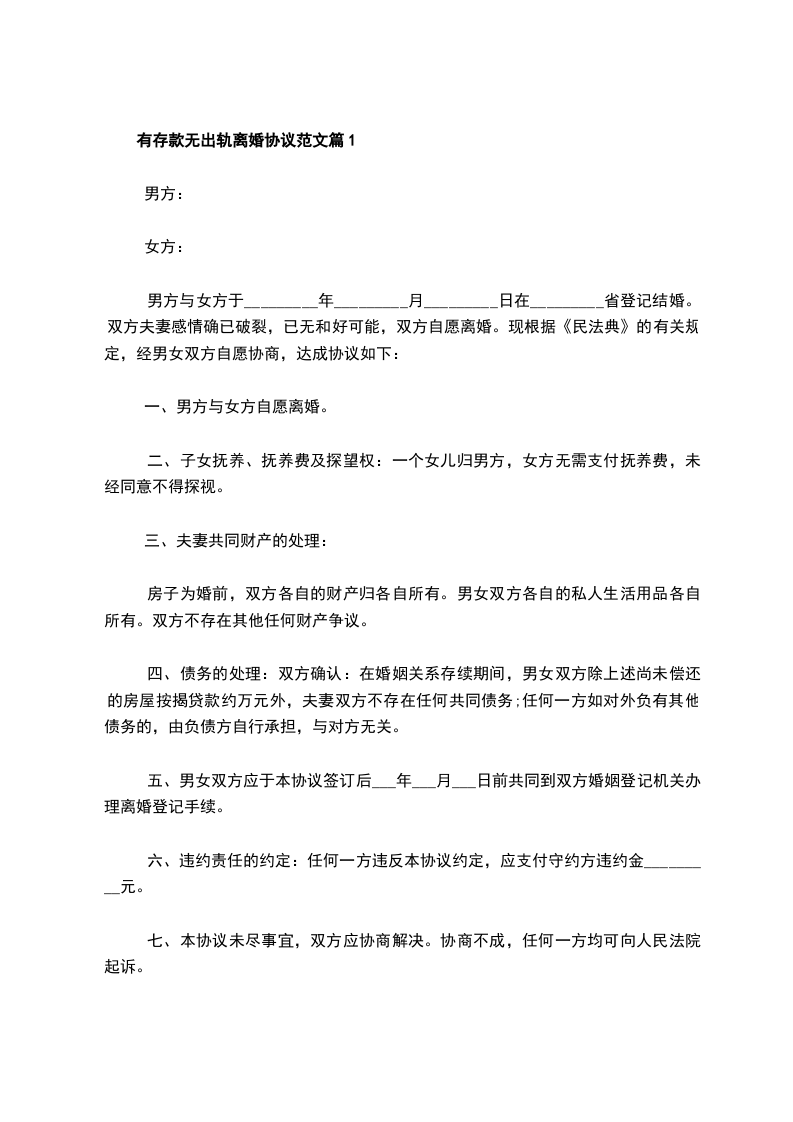 1.存款:双方名下现有银行存款共元,双方各分一半,为元。分配方式:各自名下的存款保持不变,但男方/女方应于年月日前一次性支付元给女方/男方。