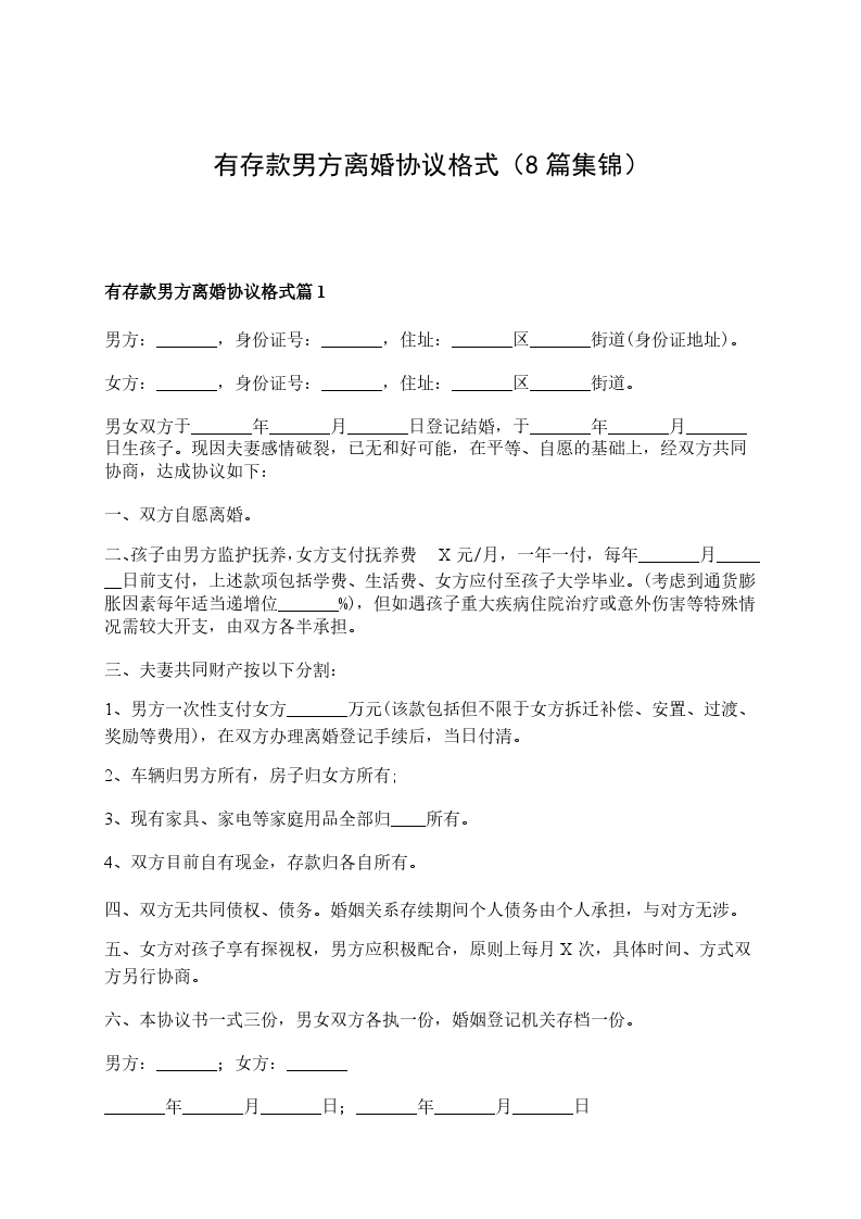 1、【存款】双方婚姻关系存续期间,目前共有存款____元,其中男方账户____元,女方账户____元,双方同意,____方在本协议签订之日起3日内给付____方____元。