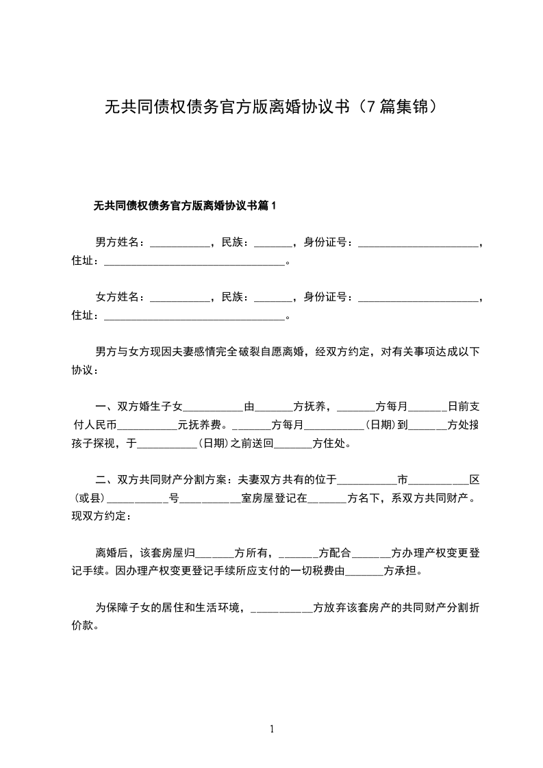 无共同的债务官方版离婚协议参考格式篇5