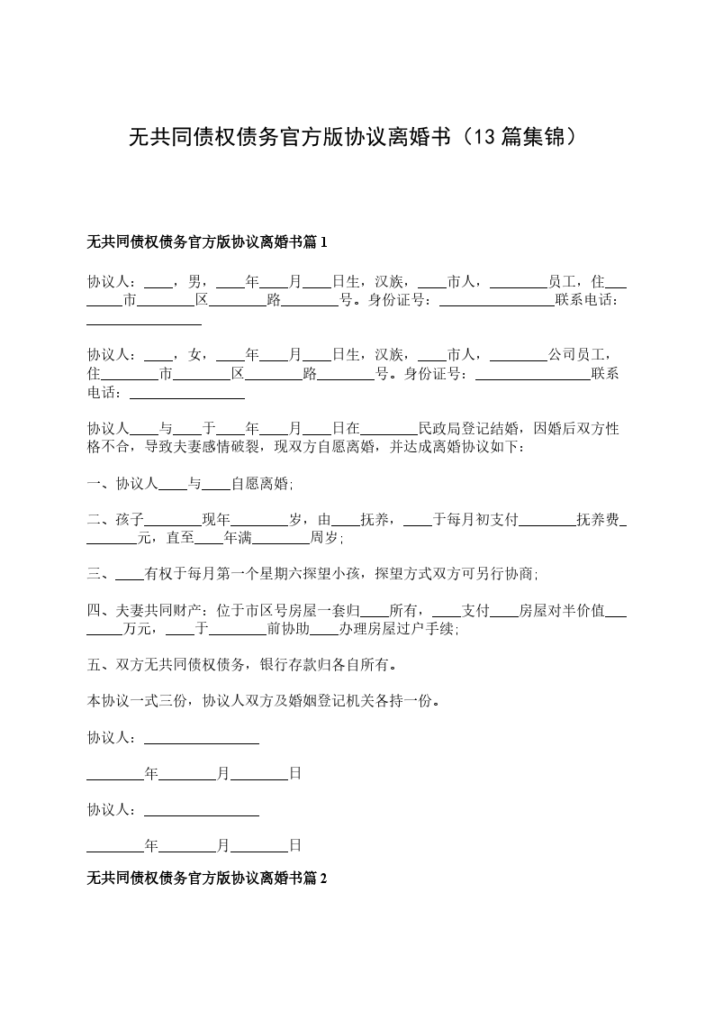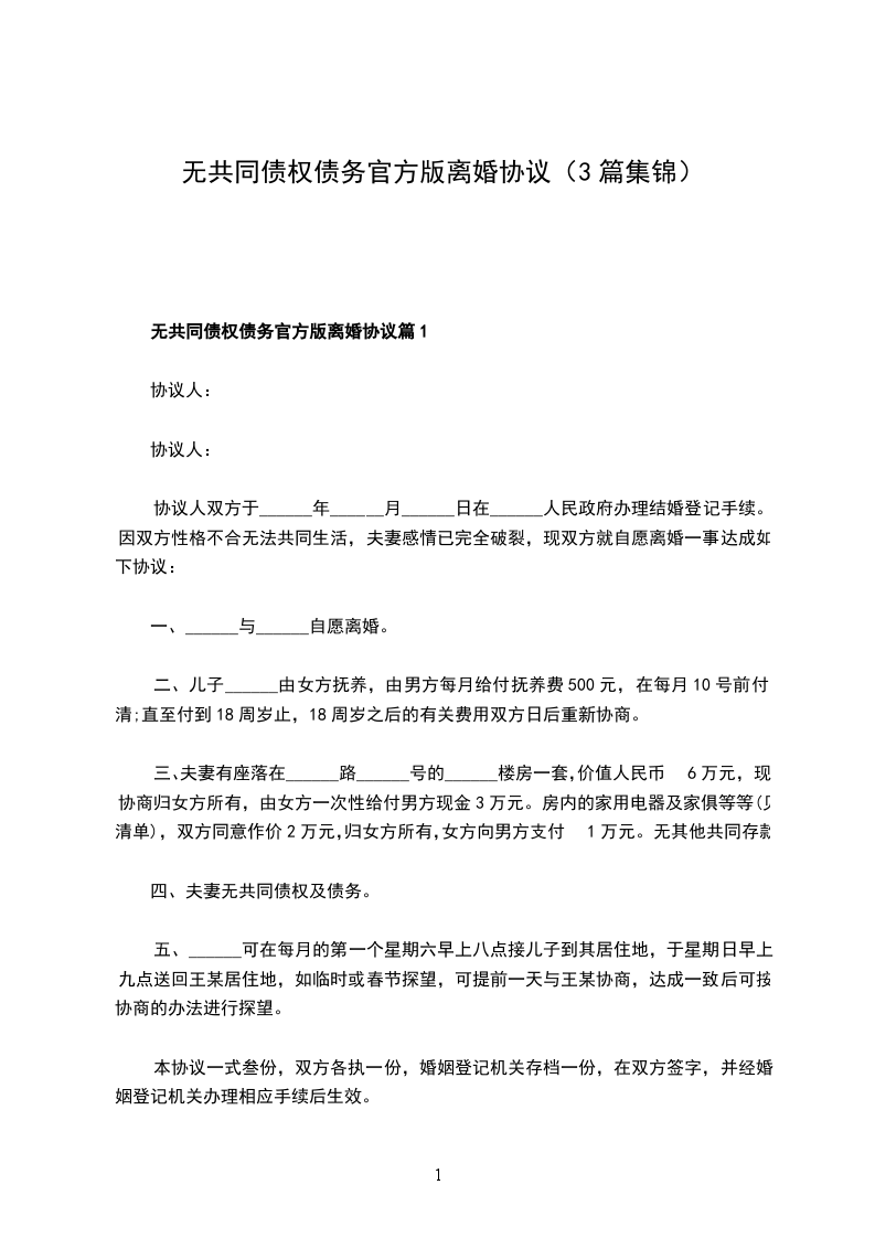 无共同的债务官方版离婚协议参考格式篇3