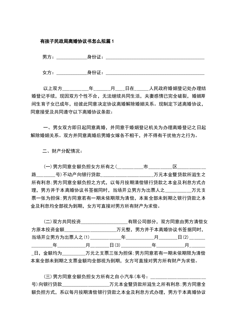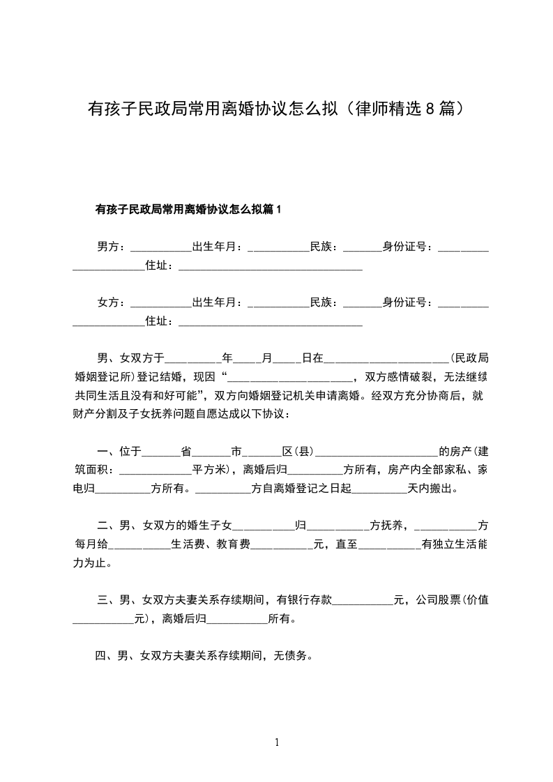双方于________年________月________日在________________人民政府的民政部门登记结婚,婚后一个子女,因双方性格不和,无法共同生活,自愿离婚,经双方协商一致,订立离婚协议如下: