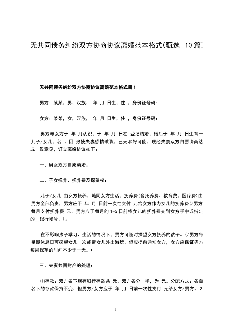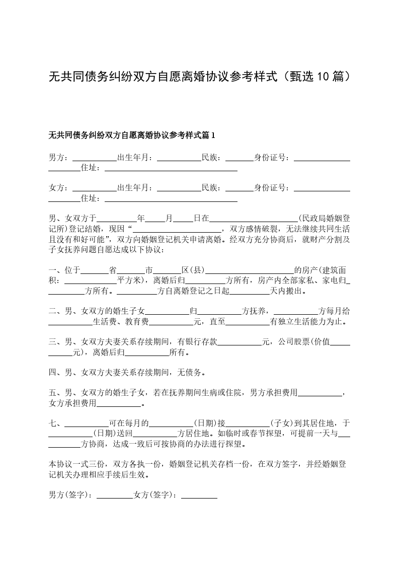 □双方确认在婚姻关系存续期间没有发生任何共同债务,任何一方如对外负有债务的,由负债方自行承担。