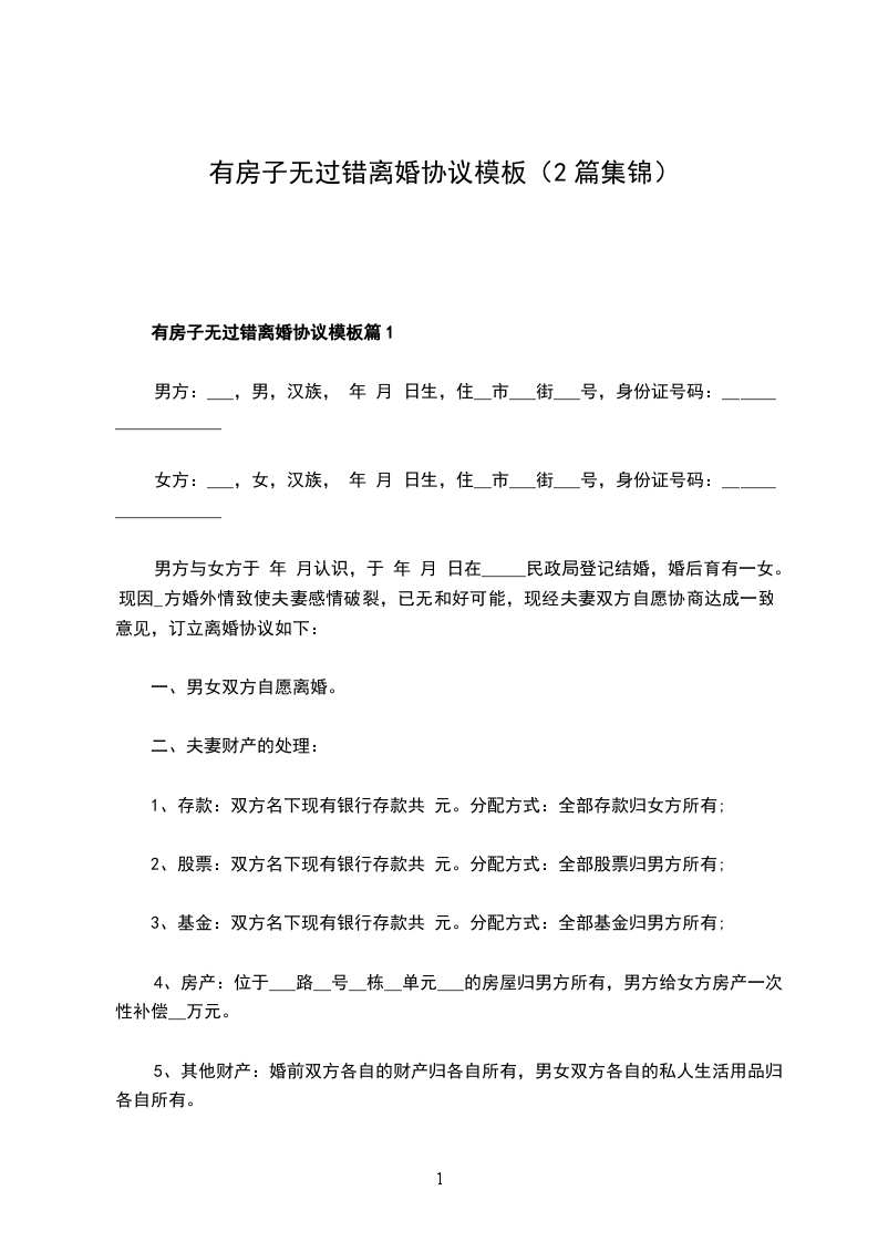 有房子无过错离婚协议模板篇1