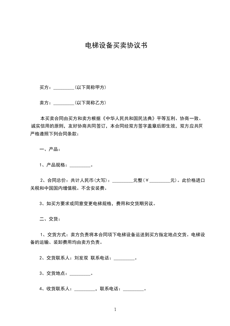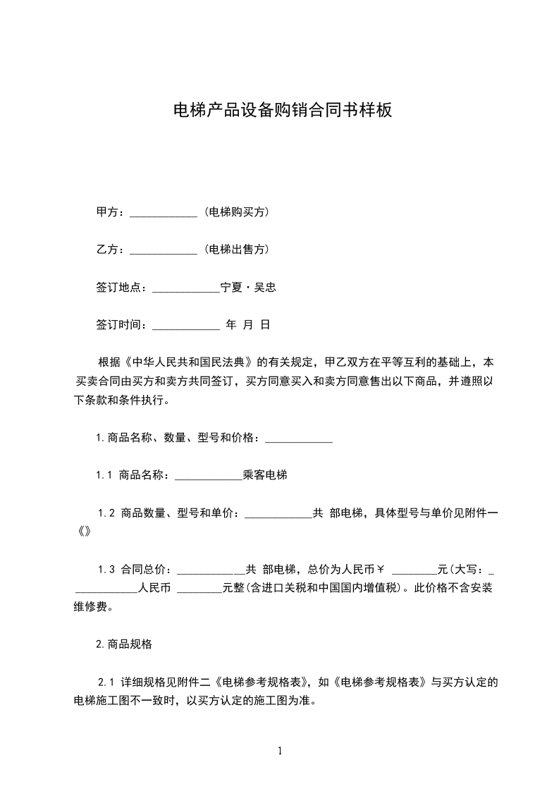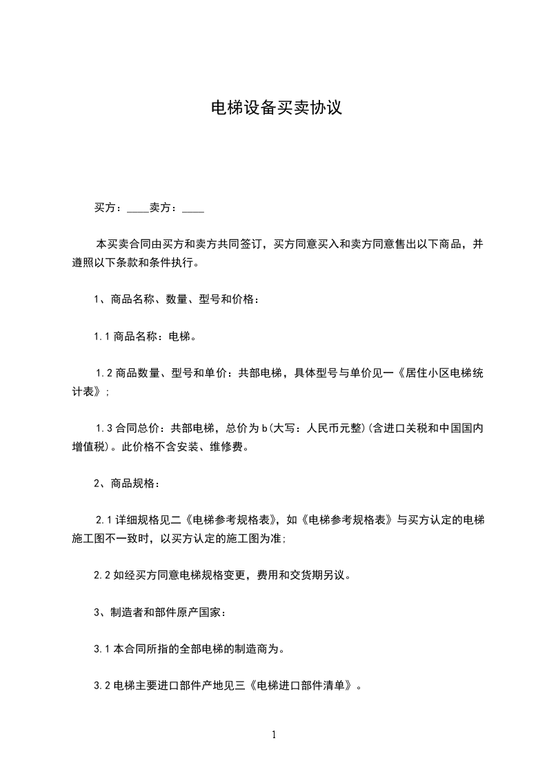 1.2 商品数量、型号和单价:____________共 部电梯,具体型号与单价见附件一《 》