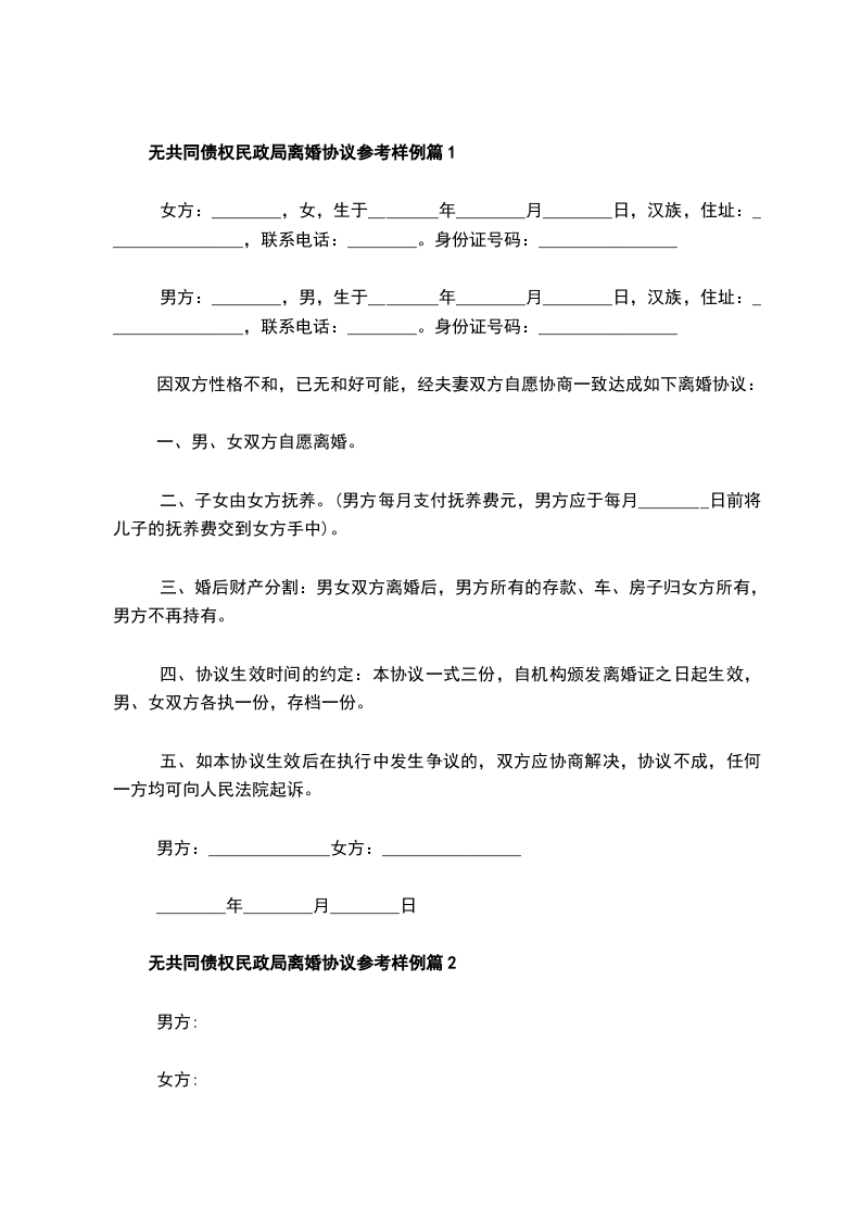四、债务的处理:双方确认:在婚姻关系存续期间,夫妻双方不存在任何共同债务;任何一方如对外负有其他债务的,由负债方自行承担,与对方无关。