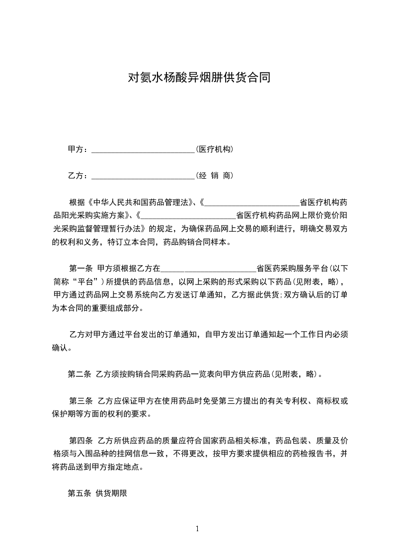 第一条 甲方须根据乙方在________________________省医药采购服务平台(以下简称“平台”)所提供的药品信息,以网上采购的形式采购以下药品(见附表,略),甲方通过药品网上交易系统向乙方发送订单通知,乙方据此供货;双方确认后的订单为本合同的重要组成部分。