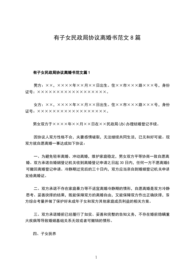 八、本协议一式三份,男、女双方各执一份,婚姻登记机关存档一份。