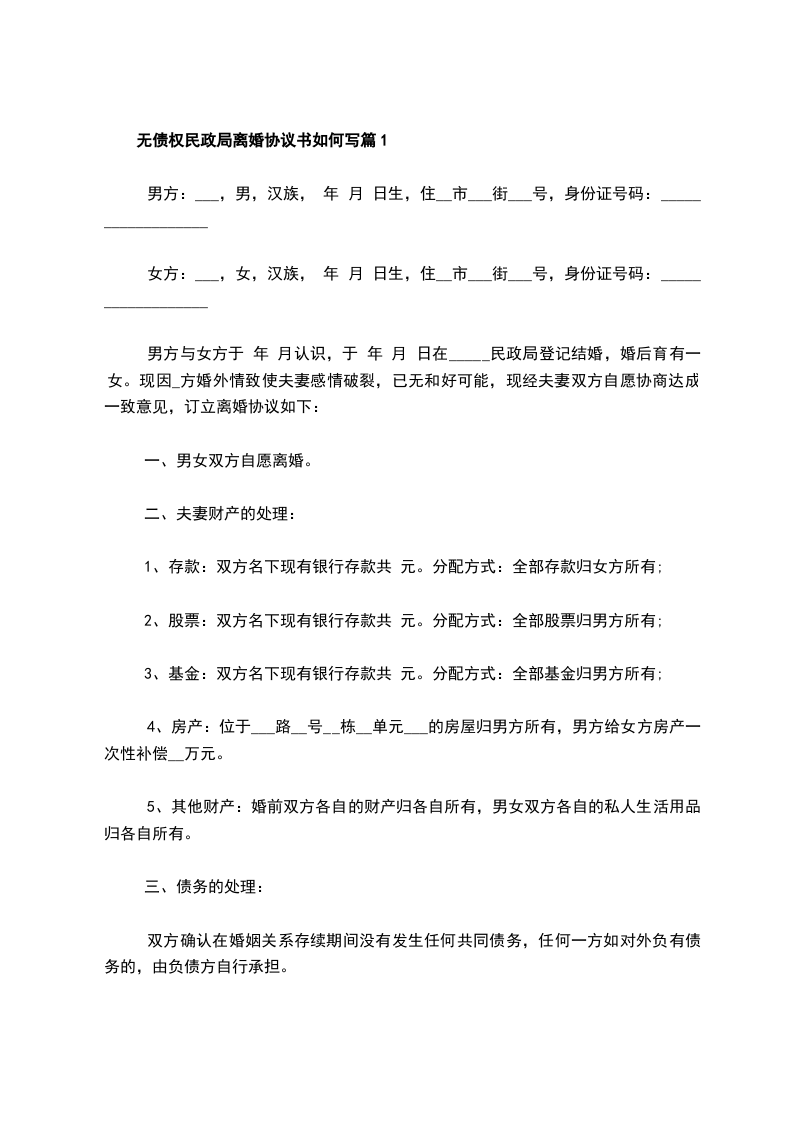 三、债权债务事项:男女双方婚姻存续期间无共同债权债务,任何一方隐瞒债务的,由负债方负责承担,另一方不承担任何责任,无债权债务纠纷。