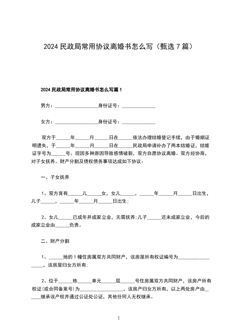 民政局离婚协议怎么写篇7