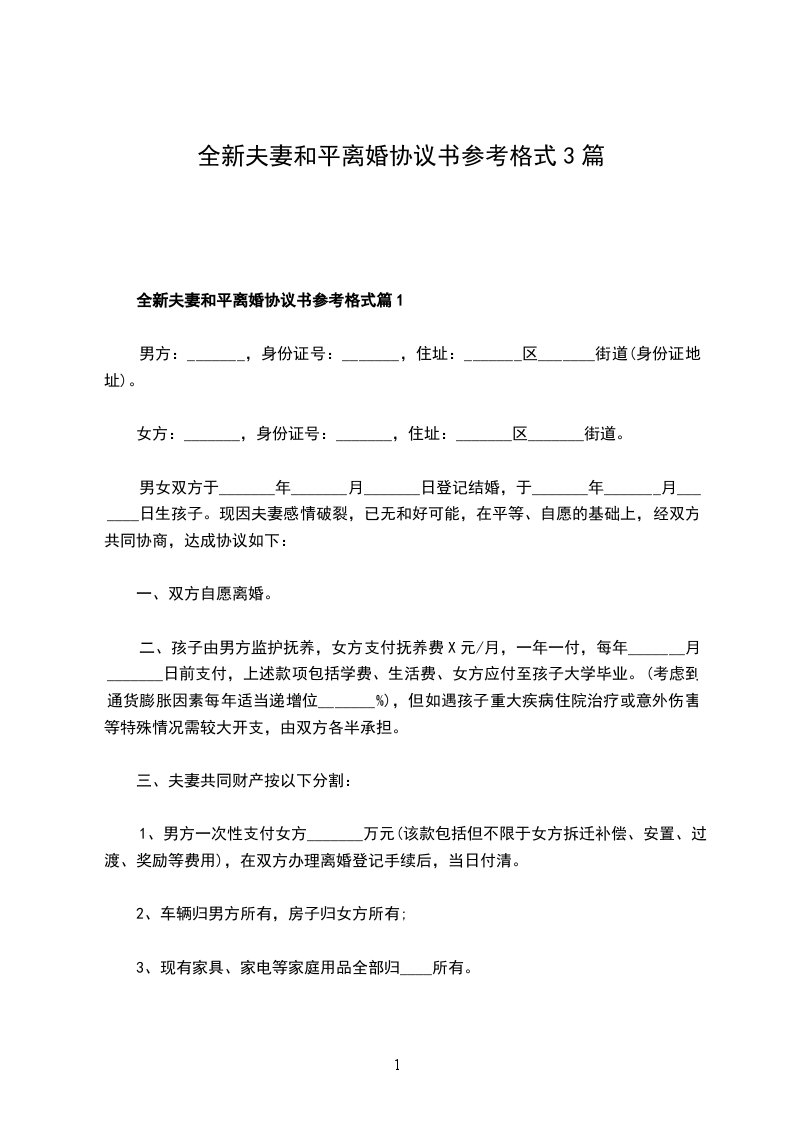 夫妻和平离婚协议参考格式篇3