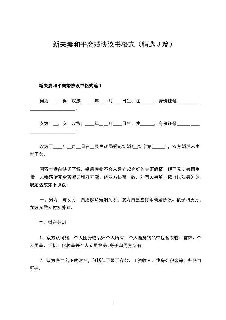 夫妻和平离婚协议参考格式篇1