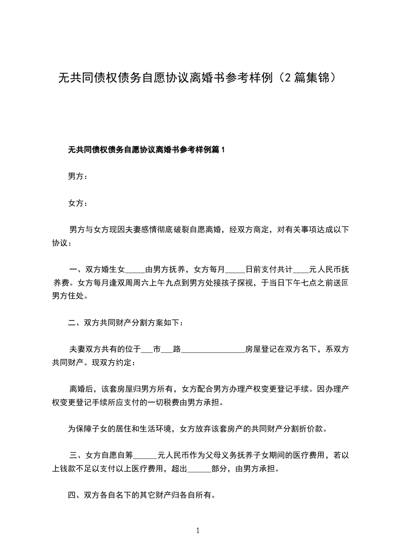 无共同债权债务自愿离婚协议书范文篇1