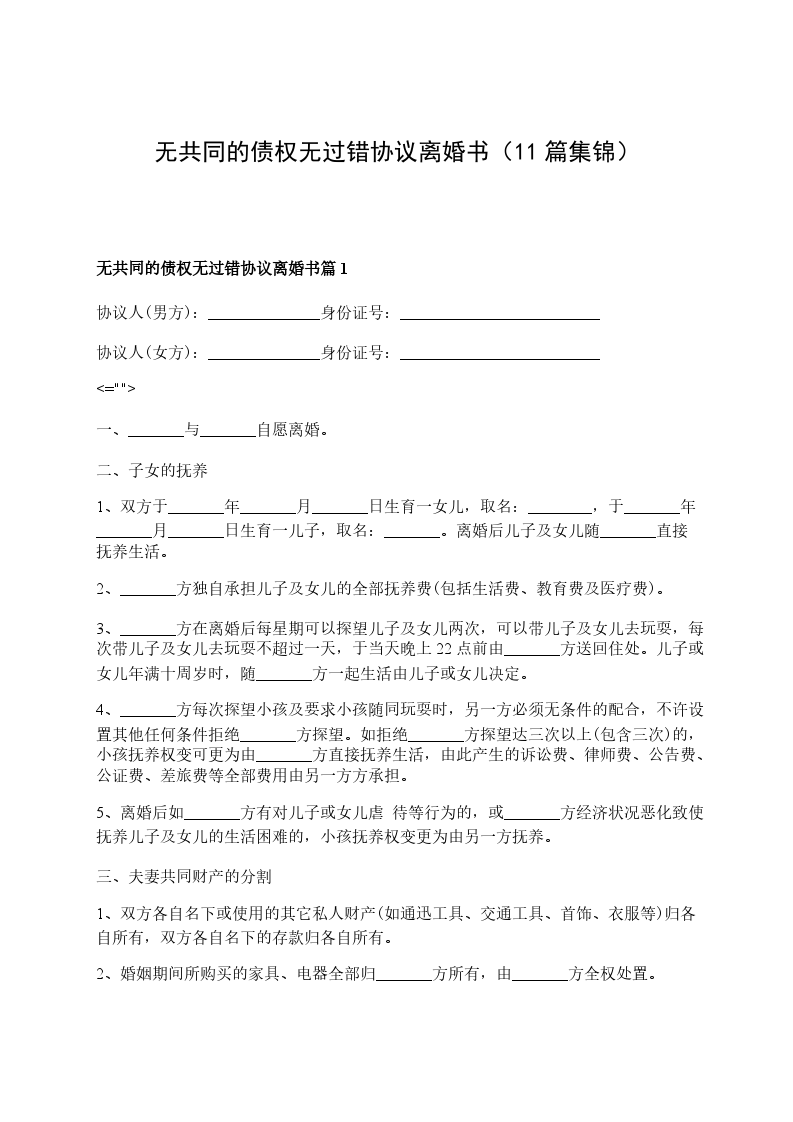 无共同的债权无过错协议离婚书篇11