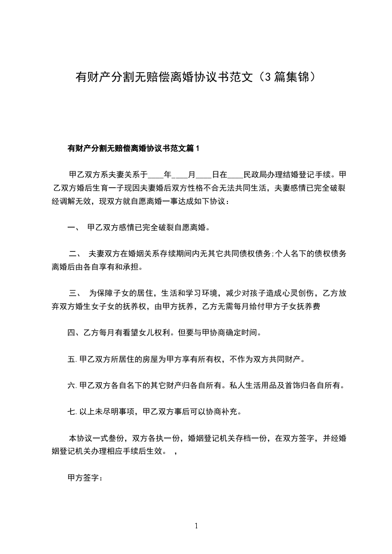 有财产分割无赔偿离婚协议书怎么写篇3