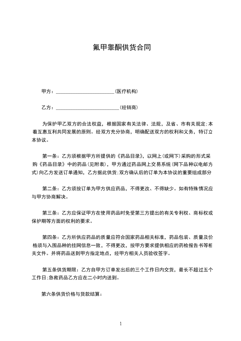 第二条:乙方须按订单为甲方供应药品,不得更改、不得缺少。如有特殊情况应与甲方协商解决。
