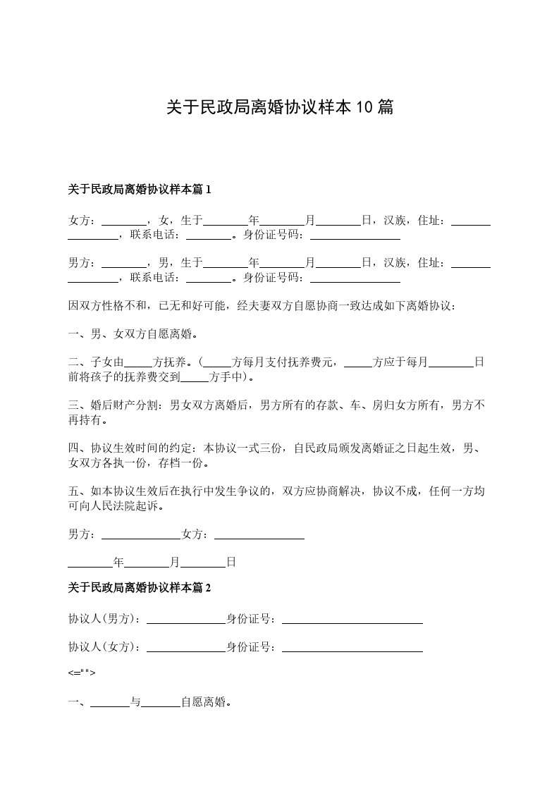 1、本协议一式三份,自婚姻登记机关颁发《离婚证》之日起生效,男、女双方各执一份,婚姻登记机关存档一份。