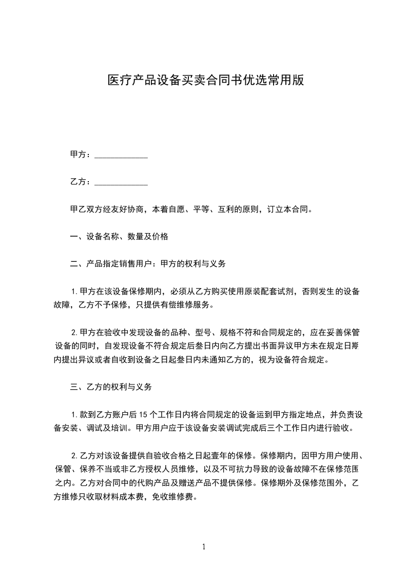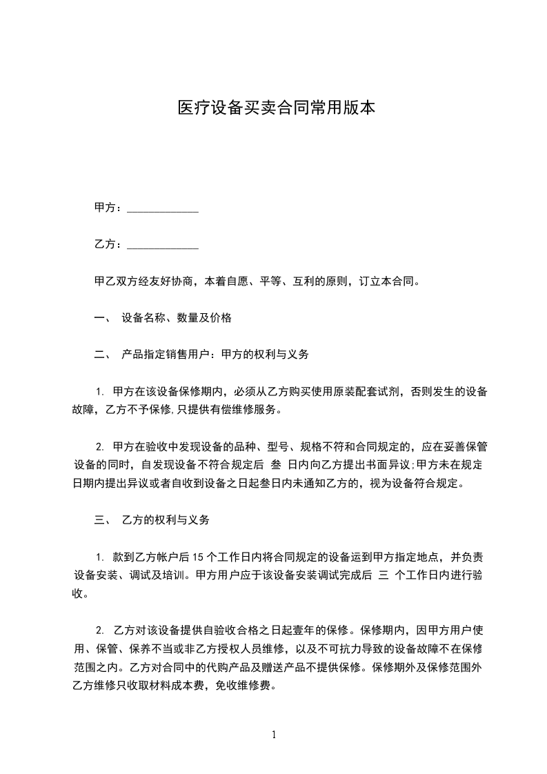 1. 甲方在该设备保修期内,必须从乙方购买使用原装配套试剂,否则发生的设备故障,乙方不予保修,只提供有偿维修服务。