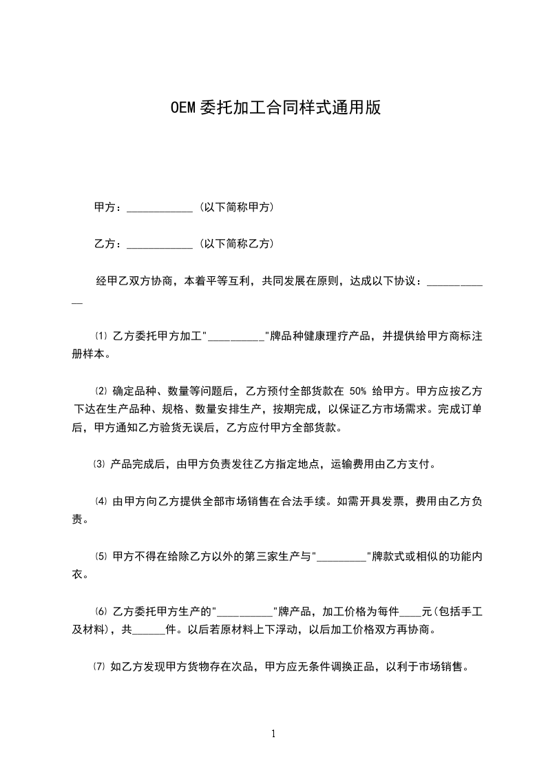 ⑴ 乙方委托甲方加工"__________"牌品种健康理疗产品,并提供给甲方商标注册样本。