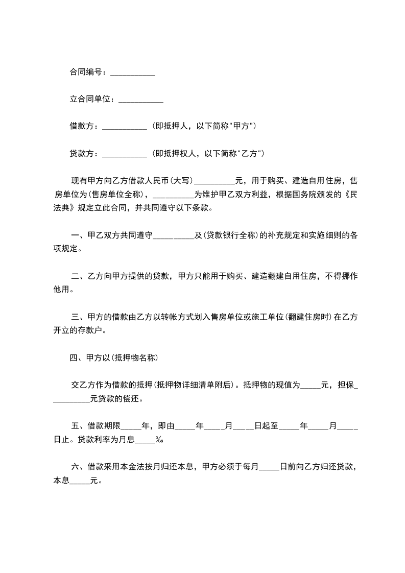 现有甲方向乙方借款人民币(大写)__________元,用于购买、建造自用住房,售房单位为(售房单位全称),__________为维护甲乙双方利益,根据国务院颁发的《民法典》规定立此合同,并共同遵守以下条款。