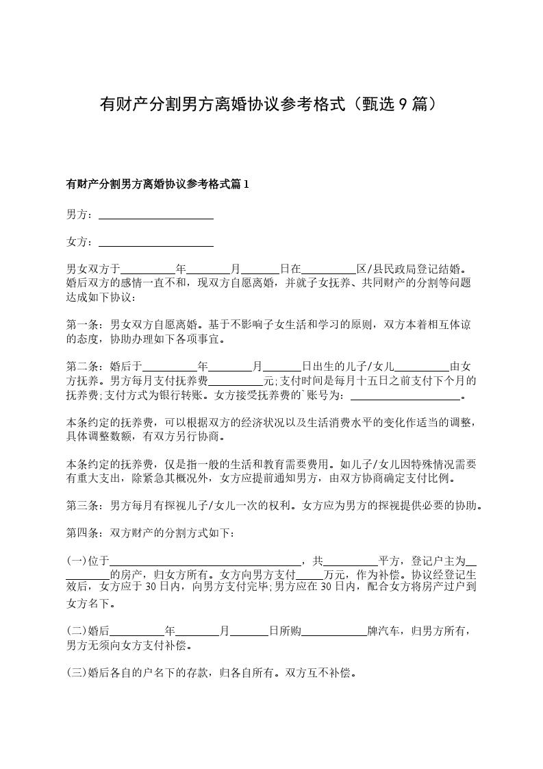 有财产分割协议离婚书参考样式篇9