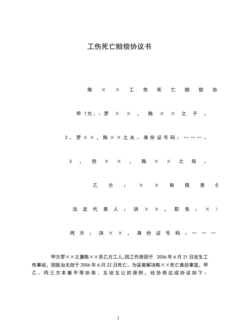 甲方________之妻________系乙方工人,因工作原因于________年____月____日发生工伤事故,因医治无效于________年____月____日死亡。为妥善解决________死亡善后事宜,甲、乙、丙三方本着平等协商、互谅互让的原则,经协商达成协议如下: