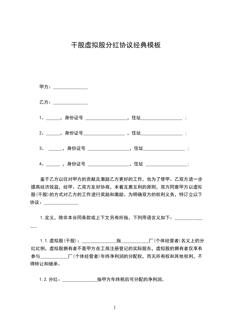 鉴于乙方以往对甲方的贡献及激励乙方更好的工作,也为了使甲、乙双方进一步提高经济效益,经甲、乙双方友好协商,本着互惠互利的原则,双方同意甲方以虚拟股(干股)的方式对乙方的工作进行奖励和激励。为明确双方的权利义务,特订立以下协议:_______________