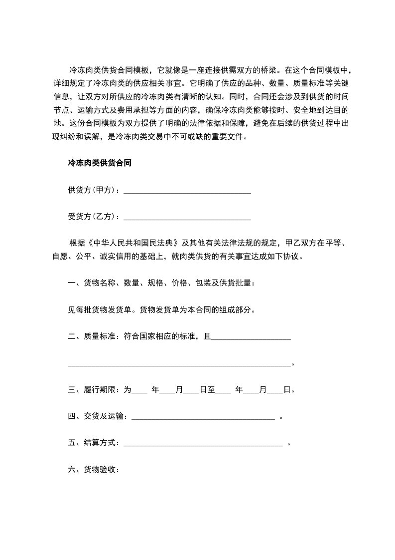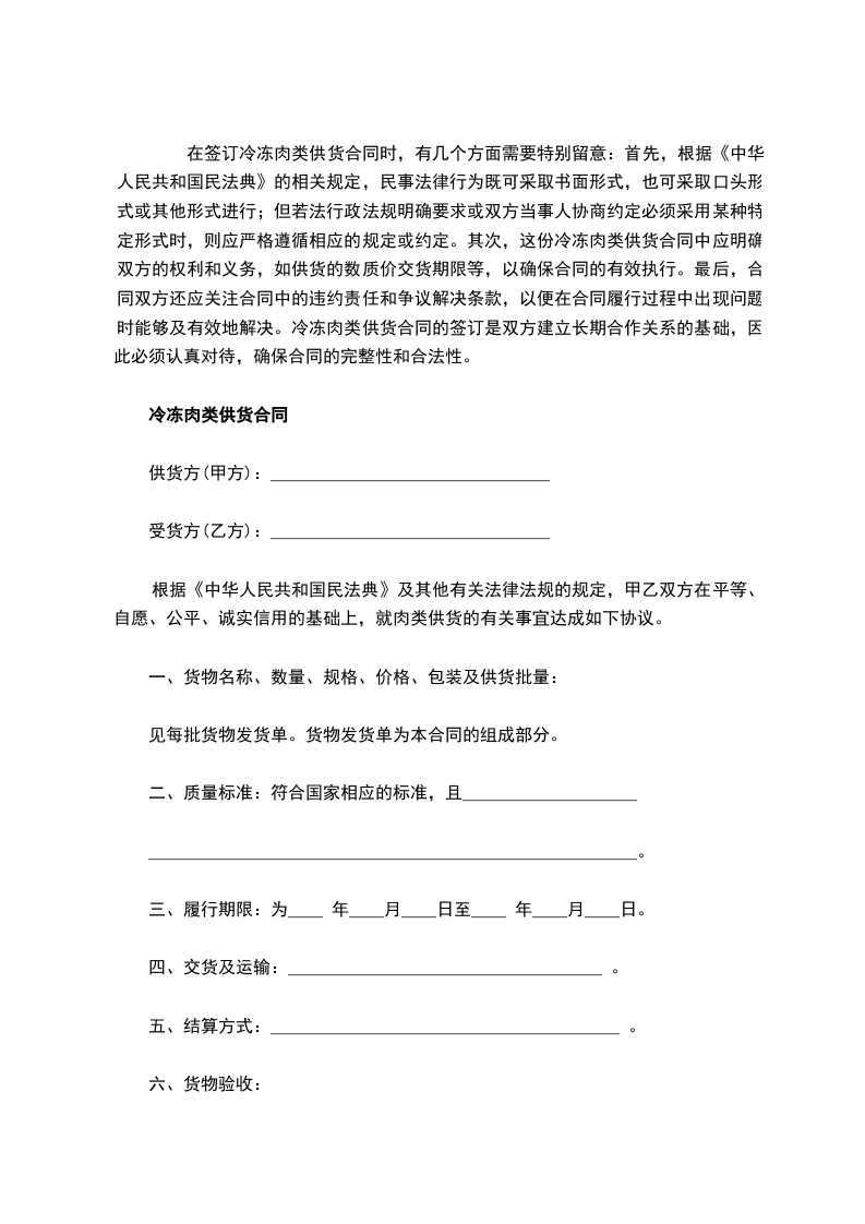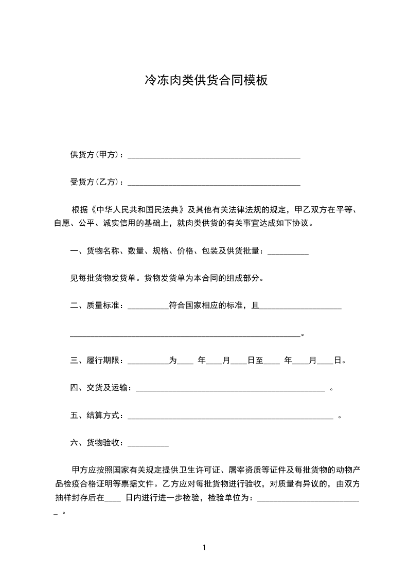 根据《中华人民共和国民法典》及其他有关法律法规的规定,甲乙双方在平等、自愿、公平、诚实信用的基础上,就肉类供货的有关事宜达成如下协议。