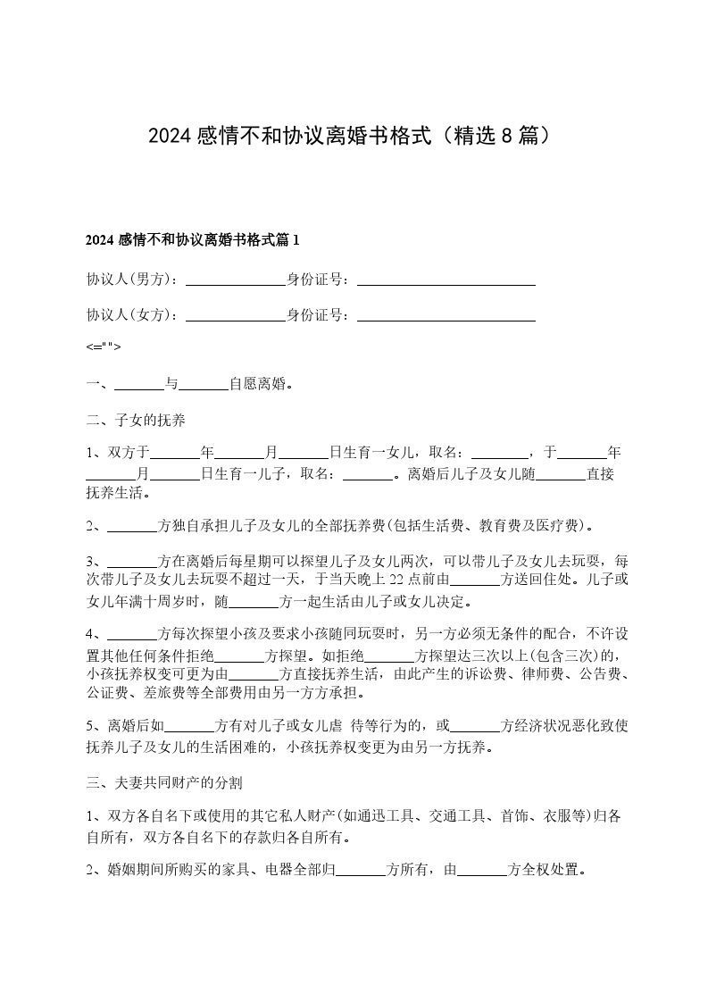 2024感情不和协议离婚书格式篇8