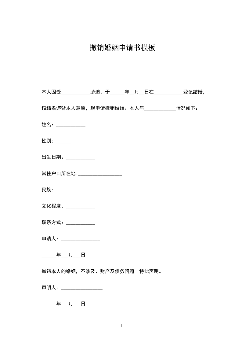 撤销本人的婚姻,不涉及、财产及债务问题。特此声明。