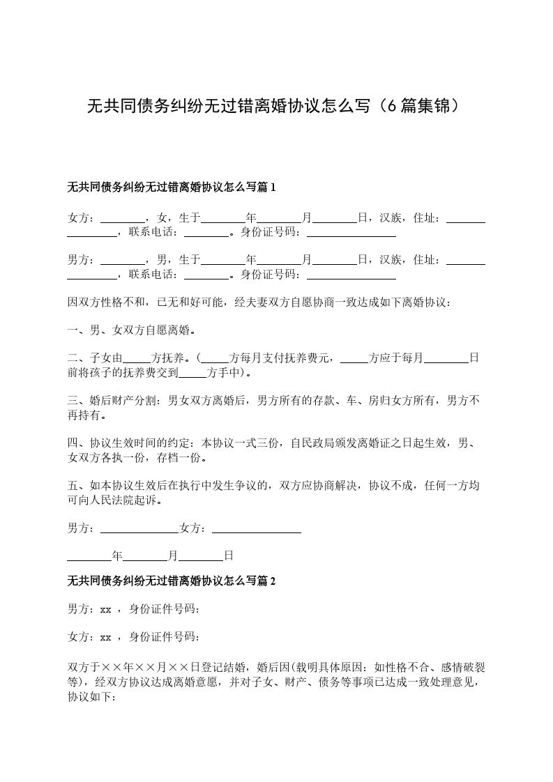 无共同债权无过错协议离婚书范文篇6