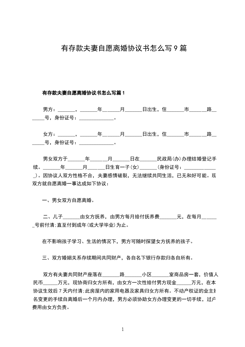 1.存款:双方名下现有银行存款共元,双方各分一半,为元。分配方式:各自名下的存款保持不变,但男方/女方应于年月日前一次性支付元给女方/男方。