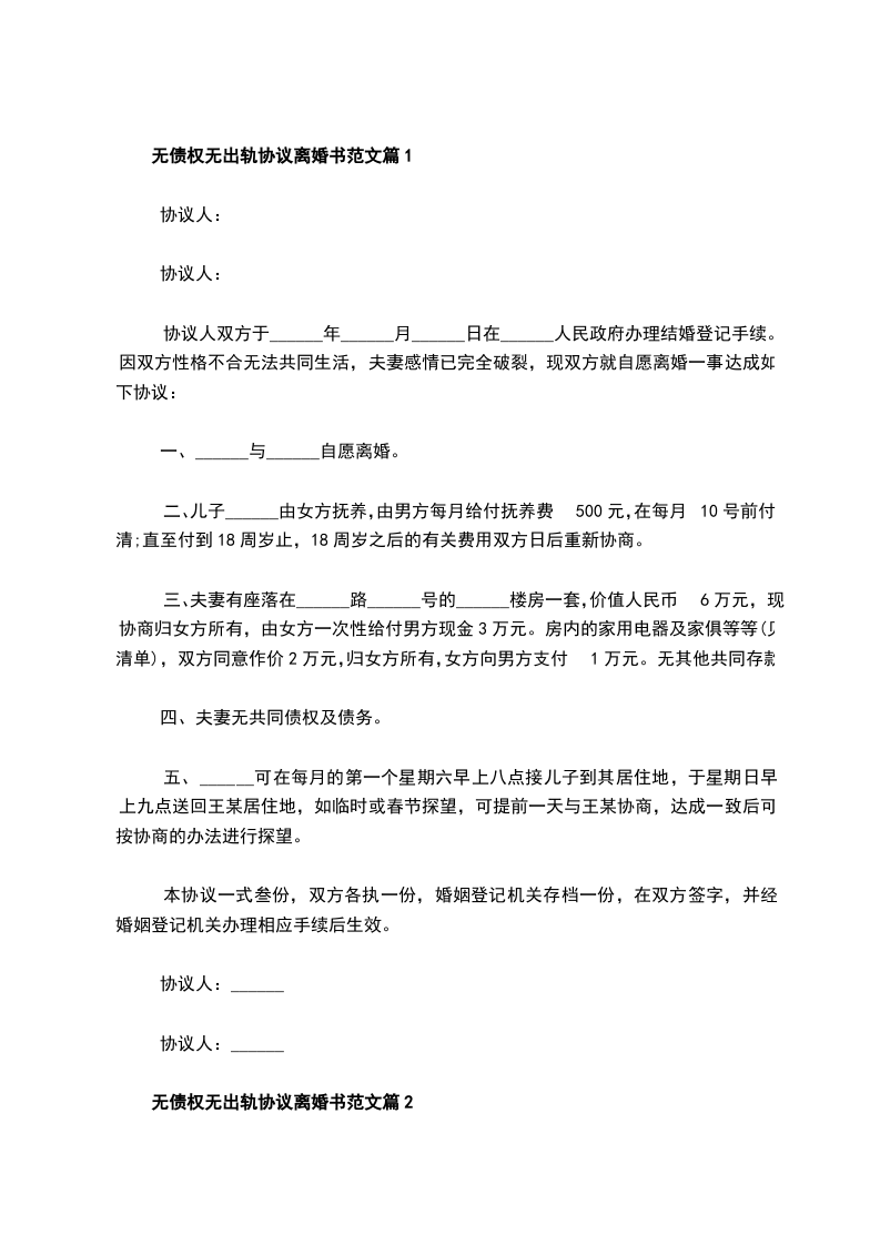 无债权无出轨协议离婚书范文篇2