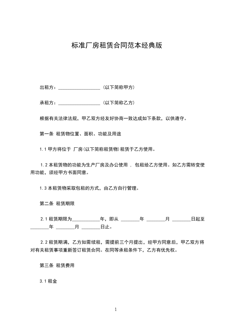 1.1甲方将位于 厂房(以下简称租赁物)租赁于乙方使用。