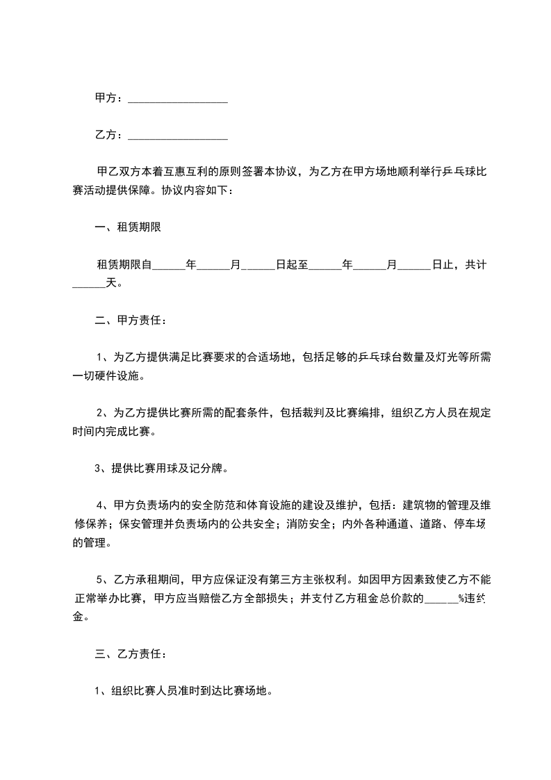 甲乙双方本着互惠互利的原则签署本协议,为乙方在甲方场地顺利举行乒乓球比赛活动提供保障。协议内容如下: