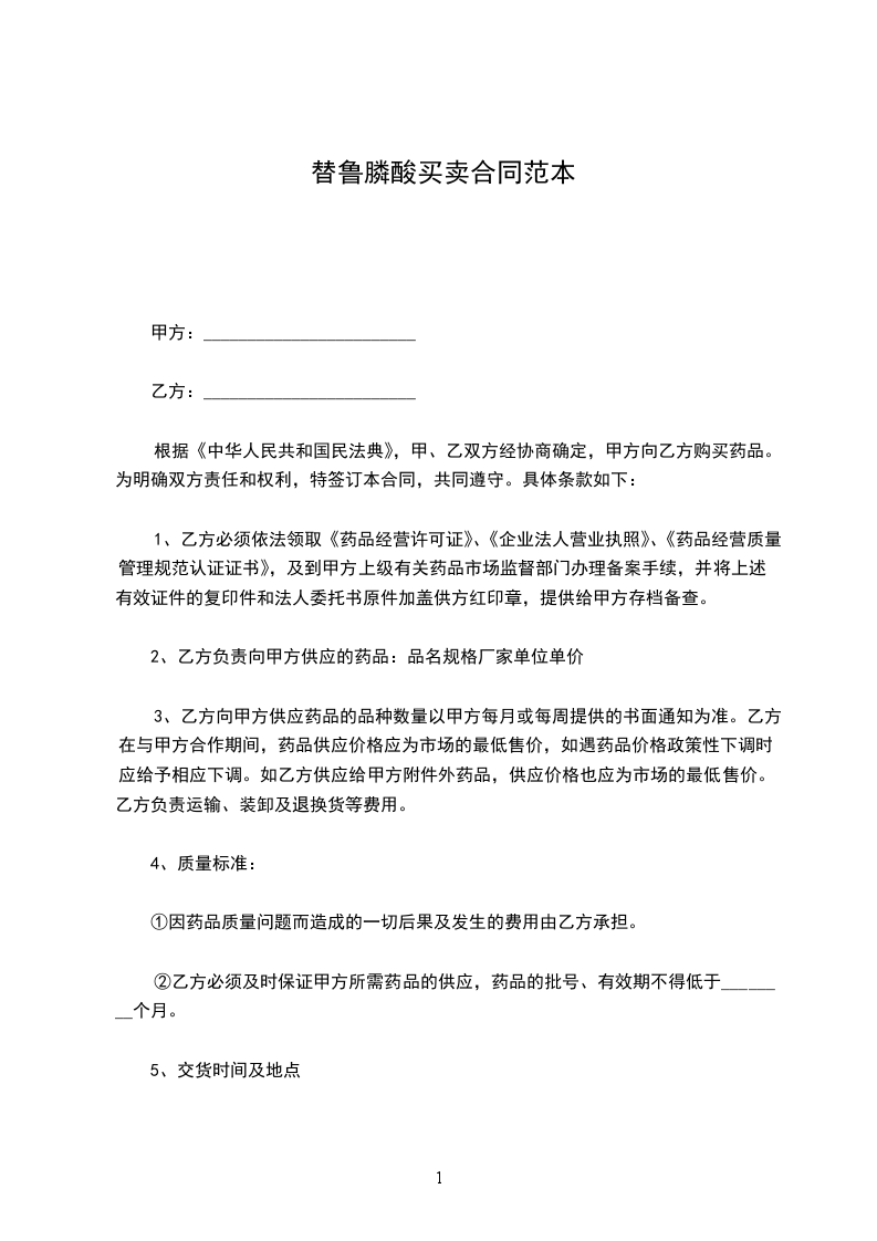 根据《中华人民共和国民法典》,甲、乙双方经协商确定,甲方向乙方购买药品。为明确双方责任和权利,特签订本合同,共同遵守。具体条款如下: