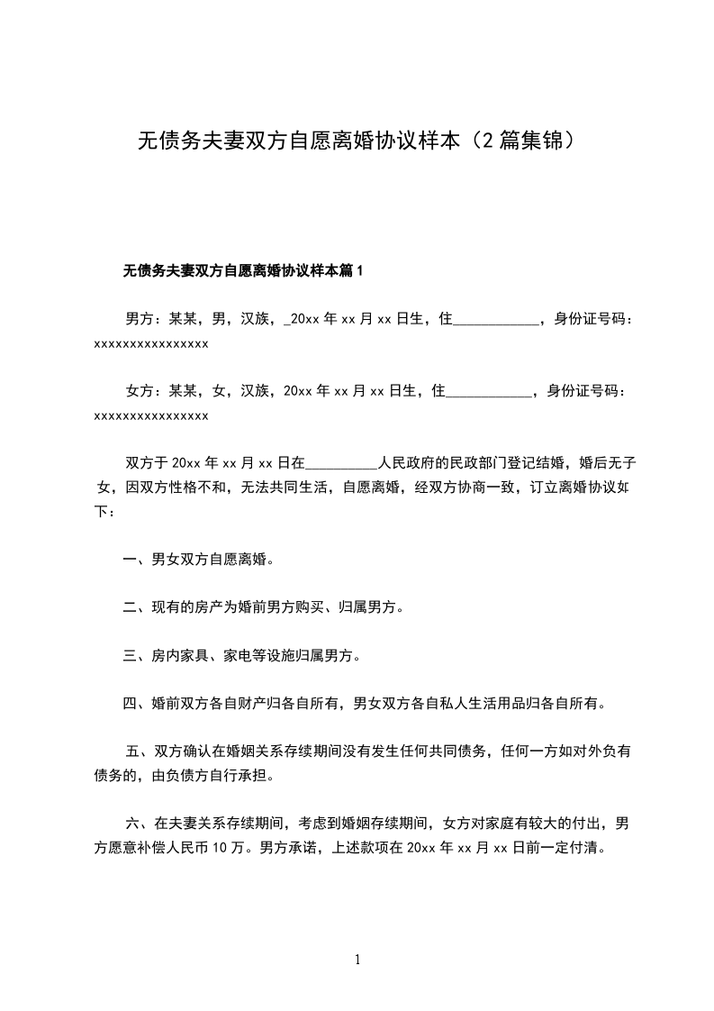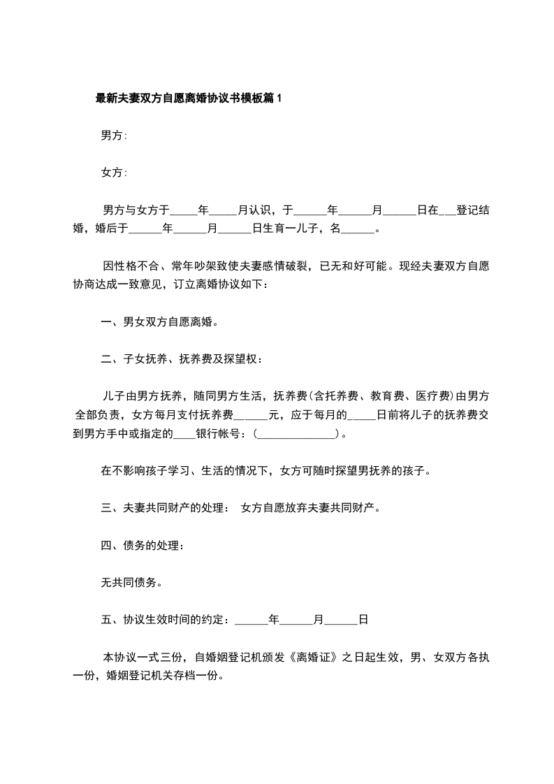 全新夫妻双方自愿离婚协议范文篇1