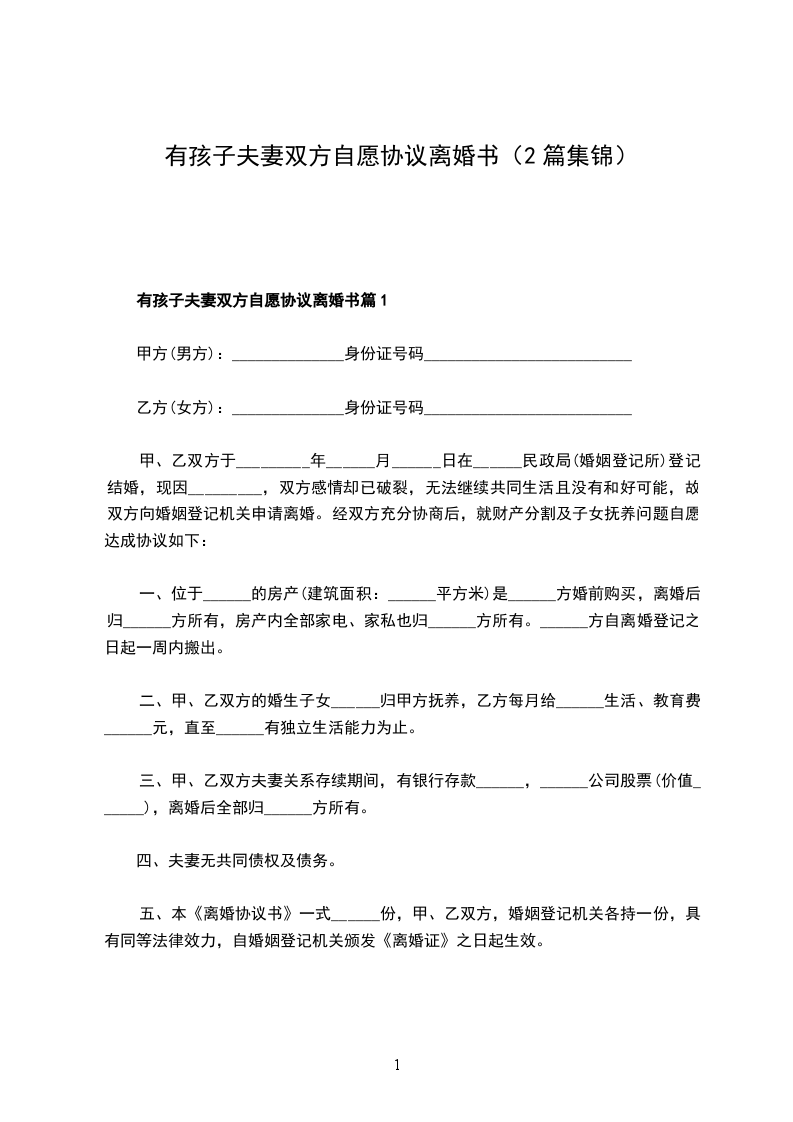 全新夫妻双方自愿离婚协议范文篇2