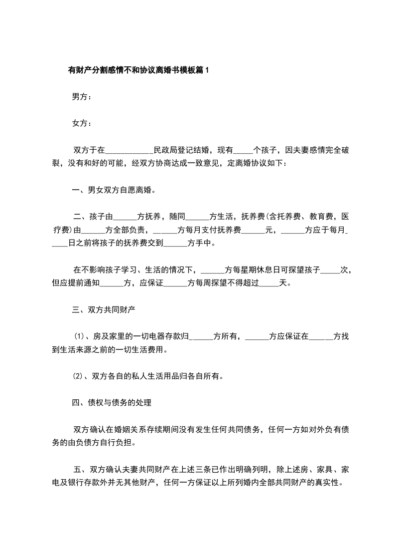 有财产分割感情不和离婚协议模板篇1