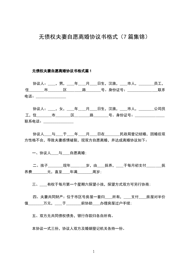 无债权夫妻自愿离婚协议书格式篇7