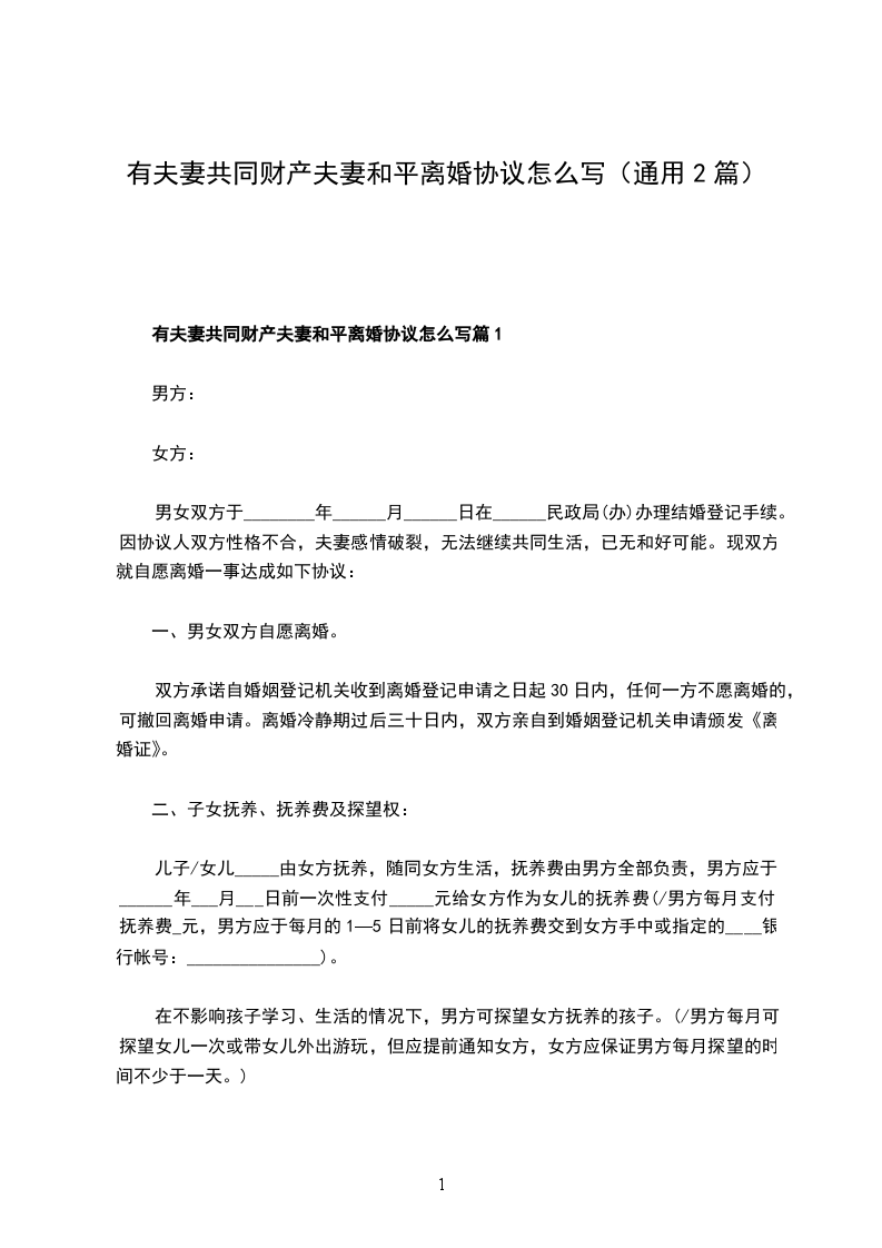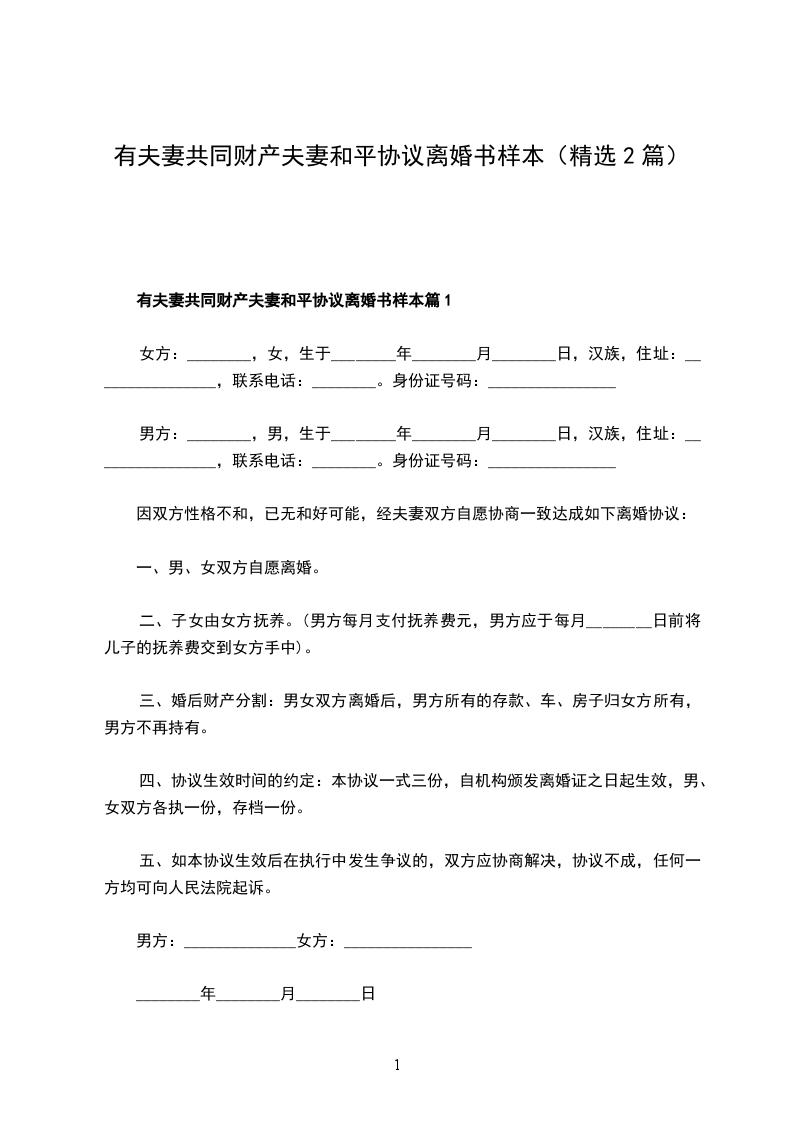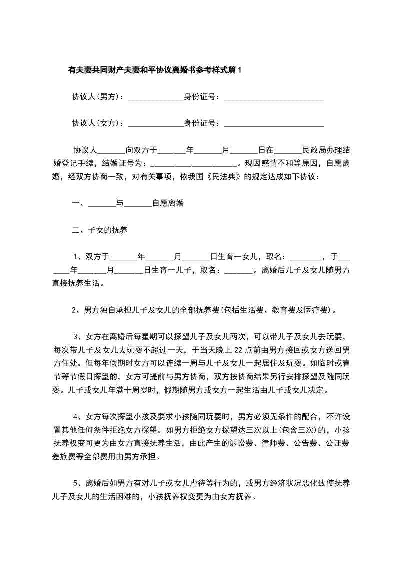 有夫妻共同财产夫妻和平协议离婚书参考样式篇1
