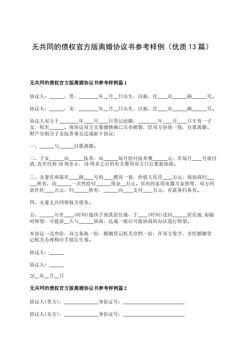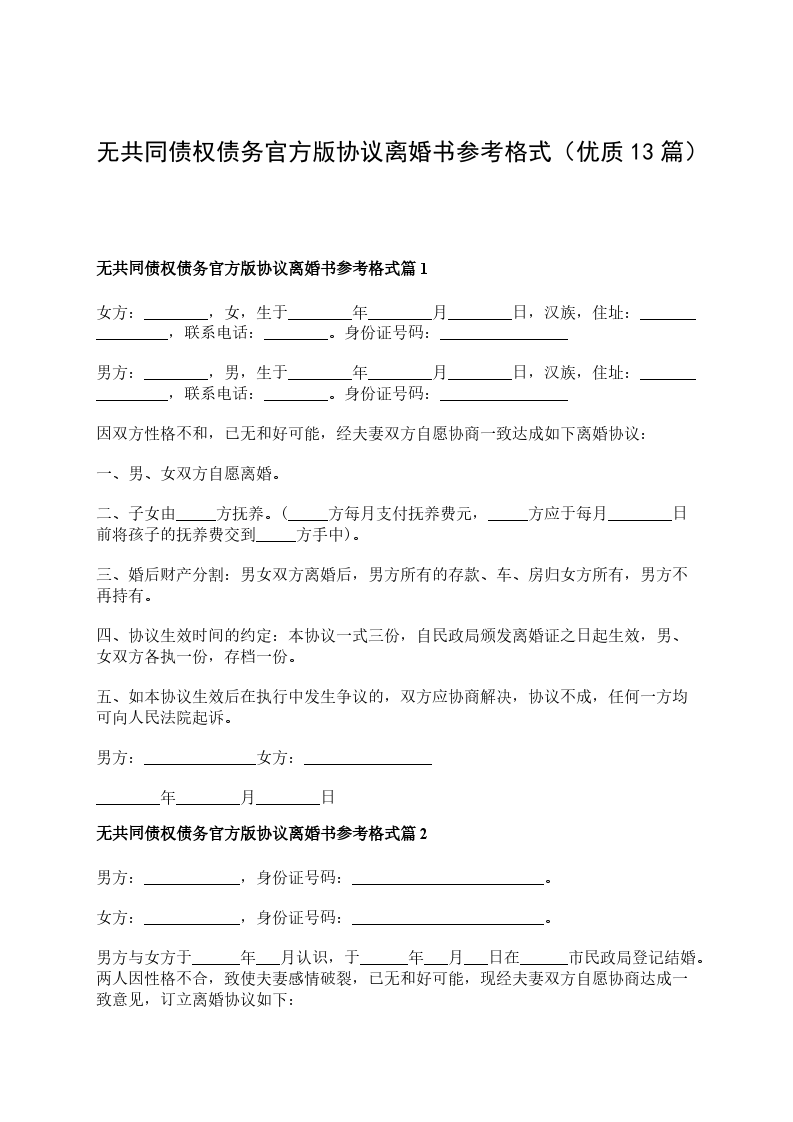 九、本协议一式________份,自婚姻登记处颁发离婚证之日起生效,男、女双方各执________份,婚姻登记机关存档一份。