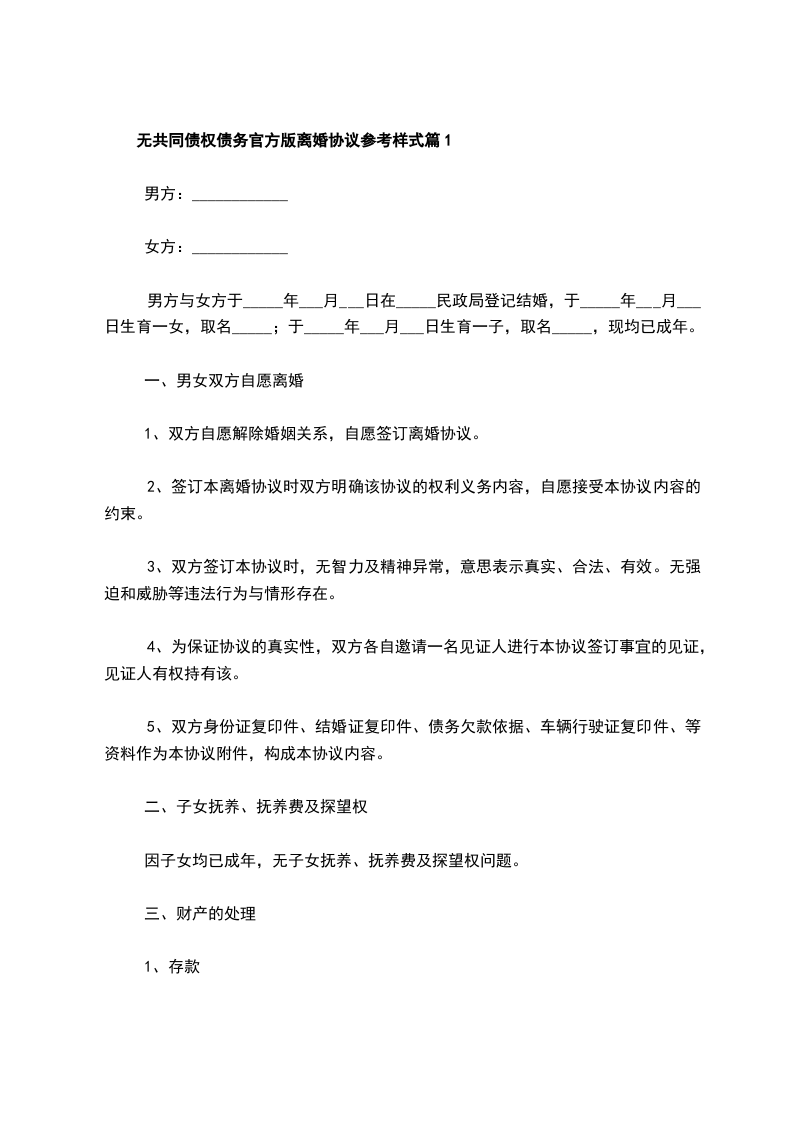 五、双方确认在婚姻关系存续期间没有发生任何共同债务,任何一方如对外负有债务的,由负债方自行承担。