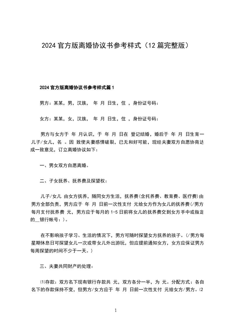 1、存款:双方名下现有银行存款共______元,双方各分一半,为______元。分配方式:各自名下的存款保持不变,但男方/女方应于_____年____月____日前一次性支付_____元给女方/男方。