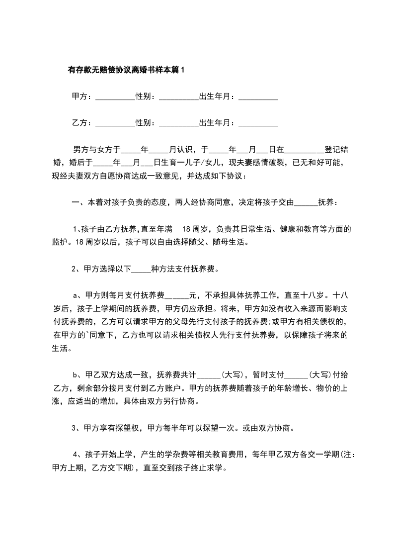 有存款无赔偿协议离婚书样本篇1