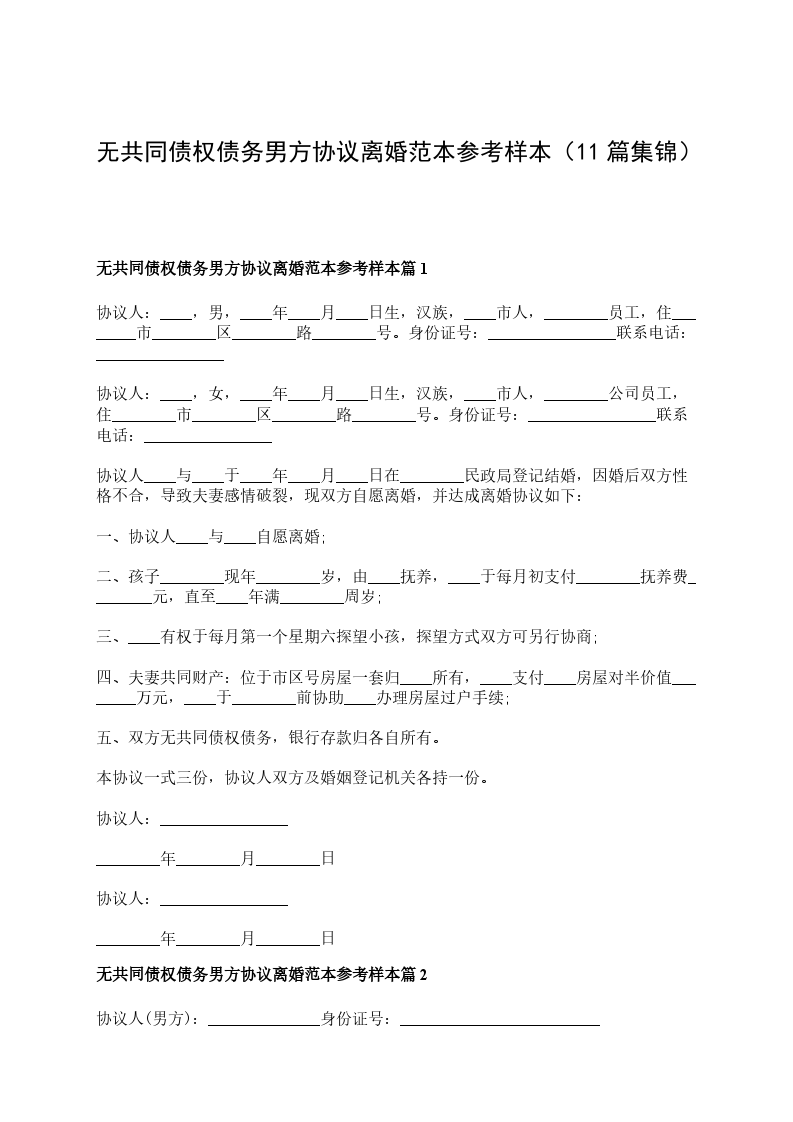 无共同的债权男方离婚协议书篇11