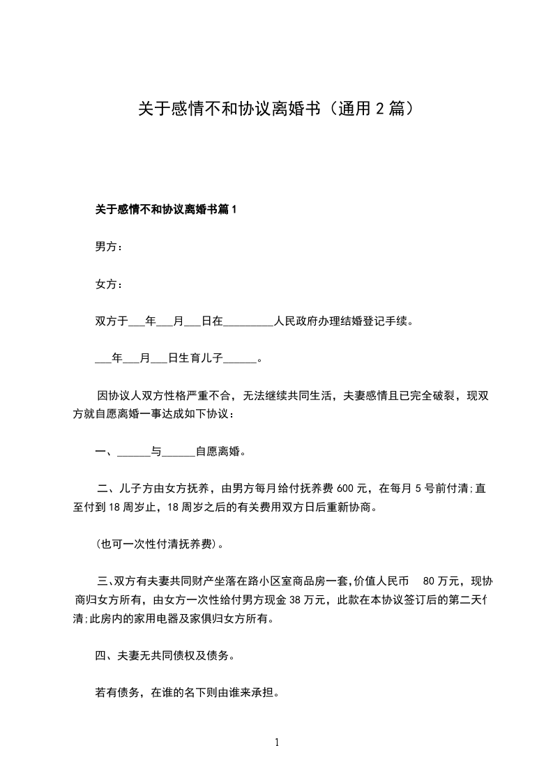 男方______与女方______于______年______月认识,于______年______月______日在______市民政局登记结婚,婚后于______年______月______日生育一儿子,名______。两人因性格不合,致使夫妻感情破裂,已无和好可能,现经夫妻双方自愿协商达成一致意见,订立离婚协议如下: