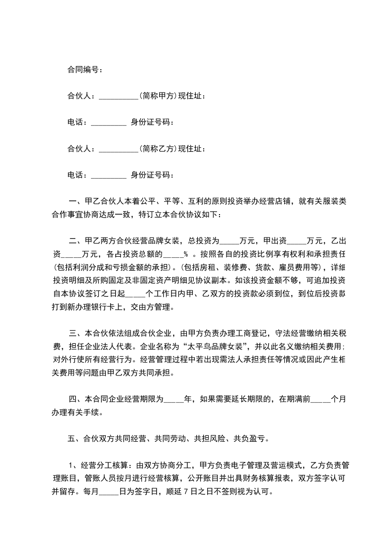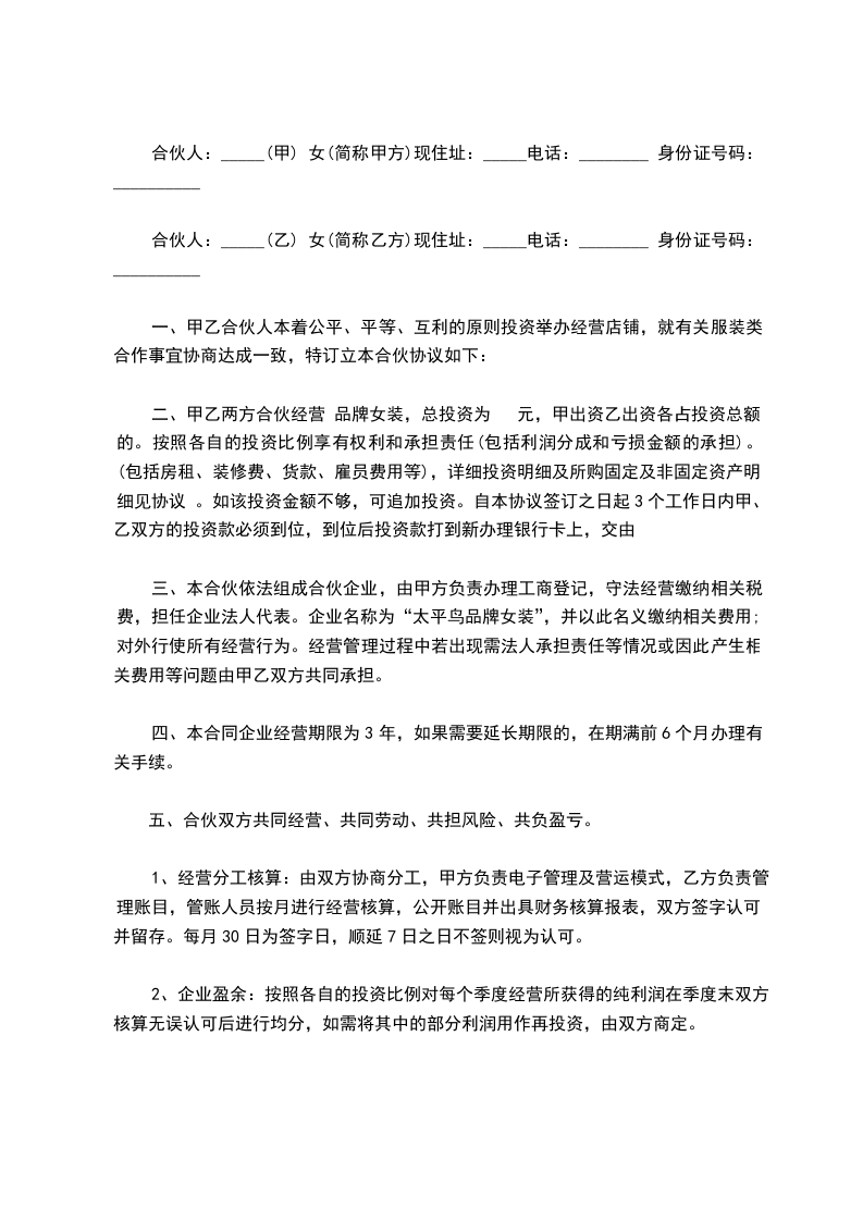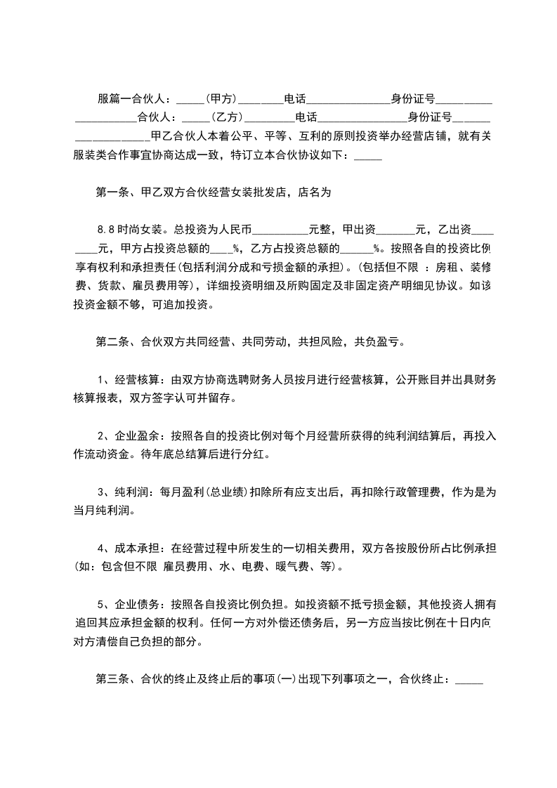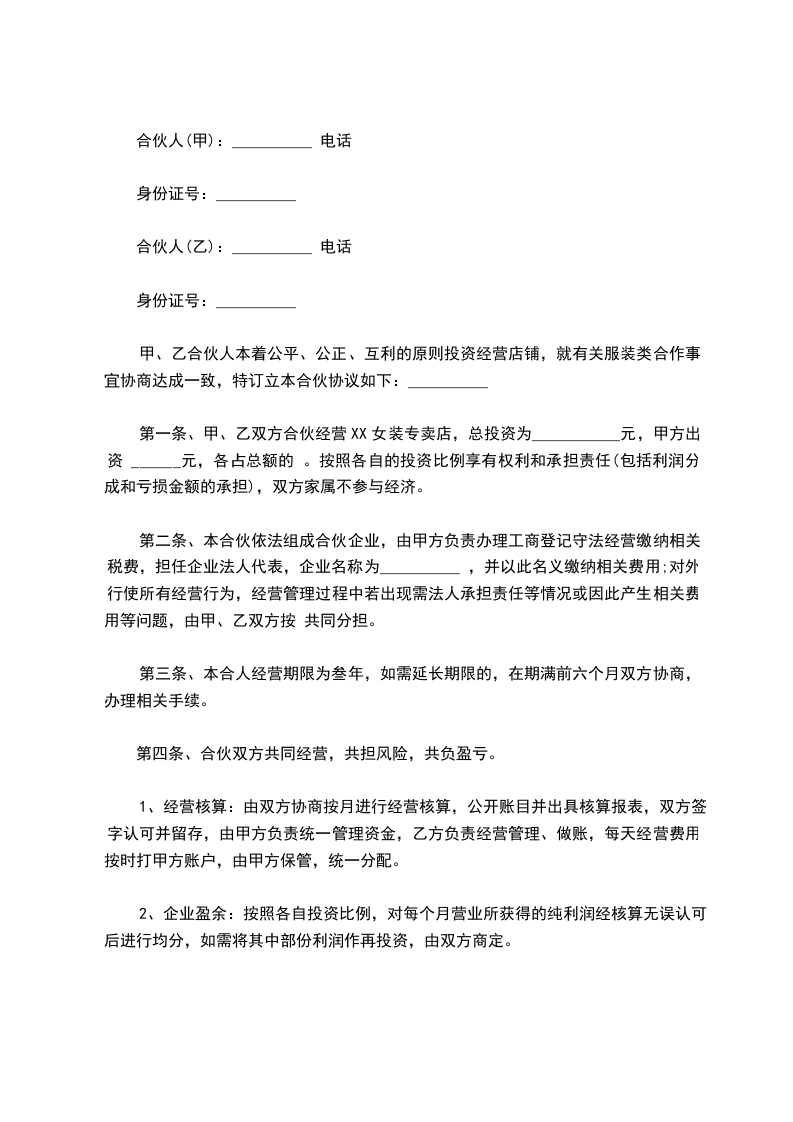 甲、乙合伙人本着公平、公正、互利的原则投资经营店铺,就有关服装类合作事宜协商达成一致,特订立本合伙协议如下:__________