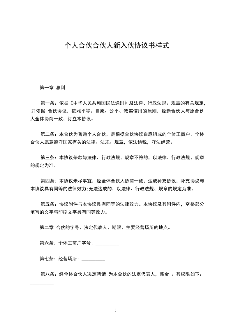 第一条:依据《中华人民共和国民法典》及法律、行政法规、规章的有关规定,并依据 合伙协议,按照平等、自愿、公平、诚实信用的原则,经新合伙人与原合伙人全体协商一致,订立本协议。